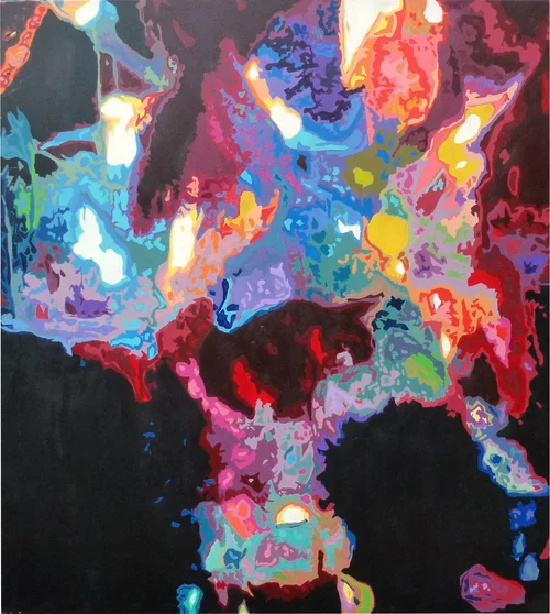 The first painting is a skill-based project. It was my first attempt at hard edge painting. The image depicts an abstracted concert scene inside the warehouse.